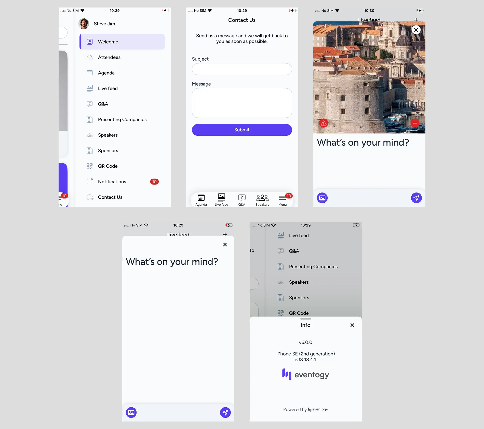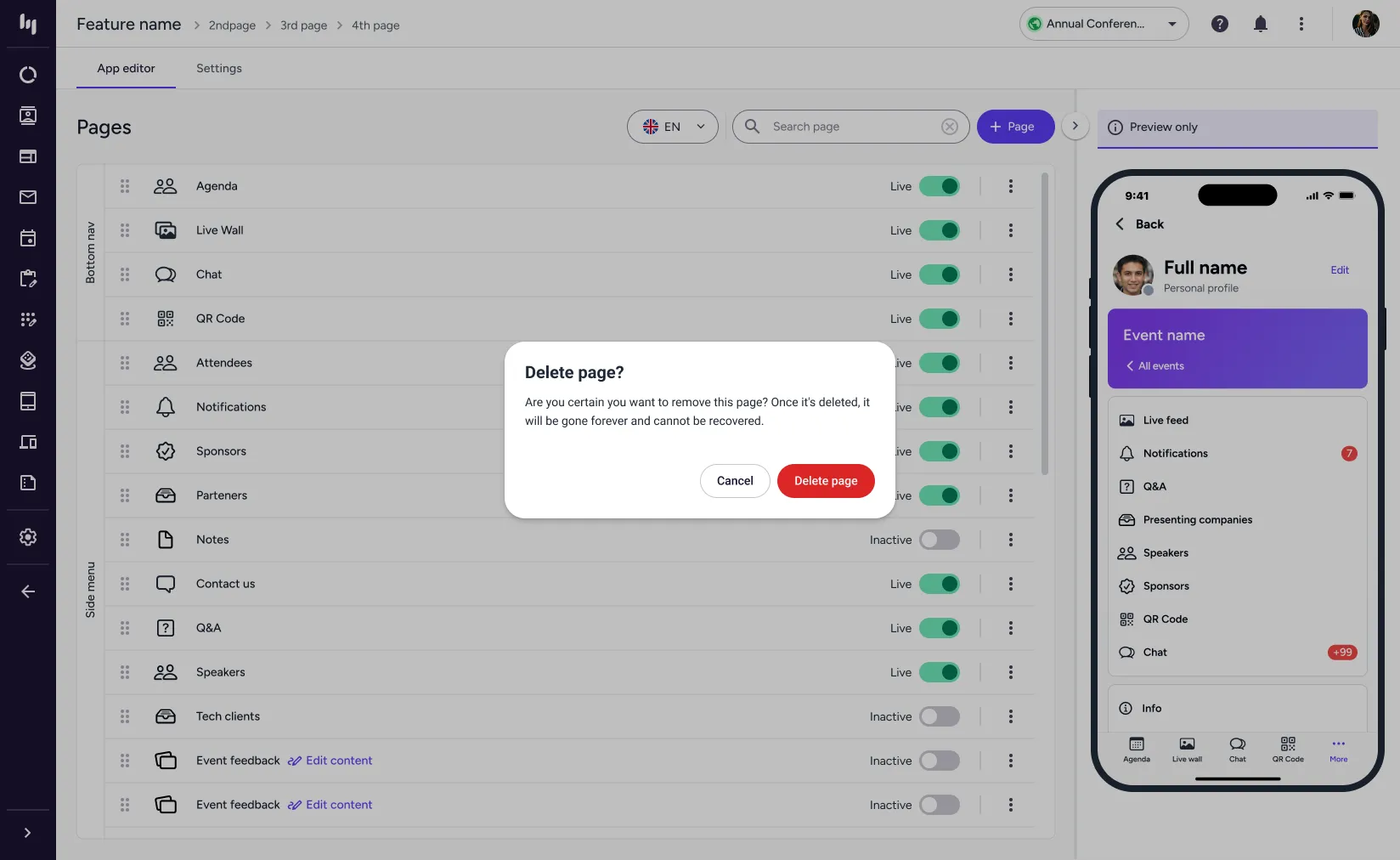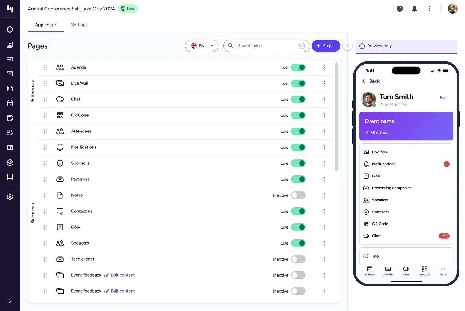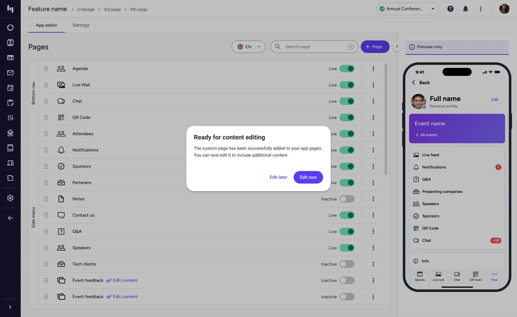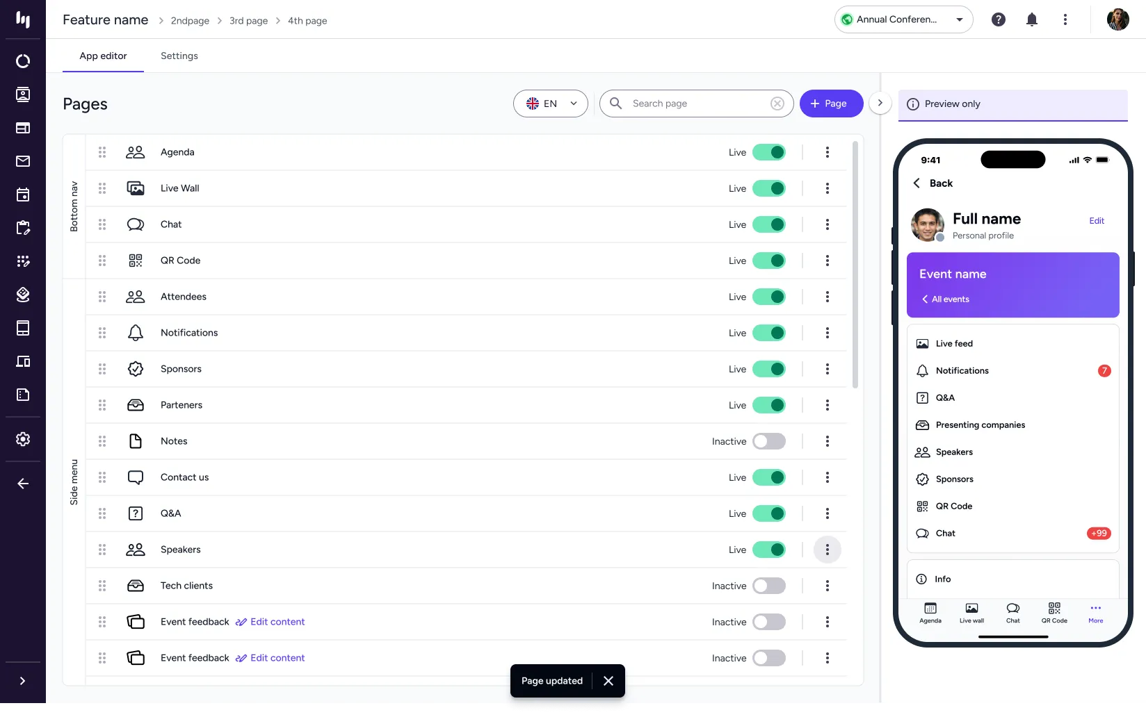 The following screens showcase features of the attendee app as managed through the web application. Admin users control and manage the appās pages, some of which follow standard templates, while others are customised, for example, event speaker collections or HTML pages with tailored content.