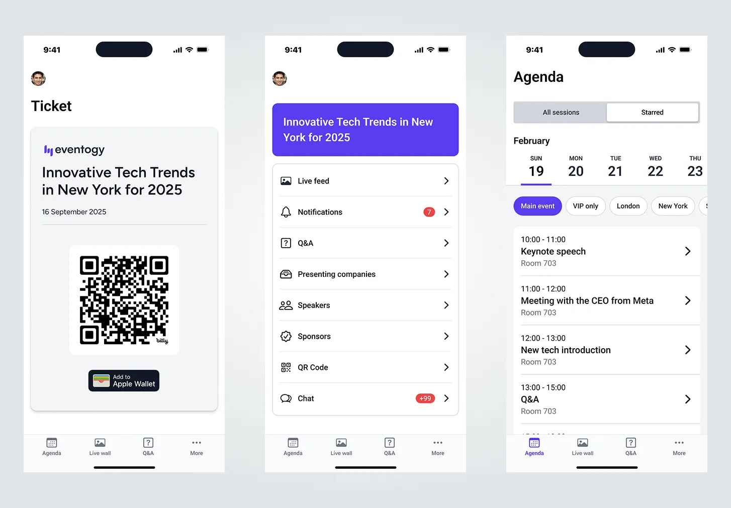 We used the existing solution as a reference, which provided all the essential functionalities for attendees, such as accessing the event with their tickets or participating in live polls. However, we made several UX improvements, focusing on modernizing the UI and ensuring scalability. This allows clients to seamlessly select their brand colors.